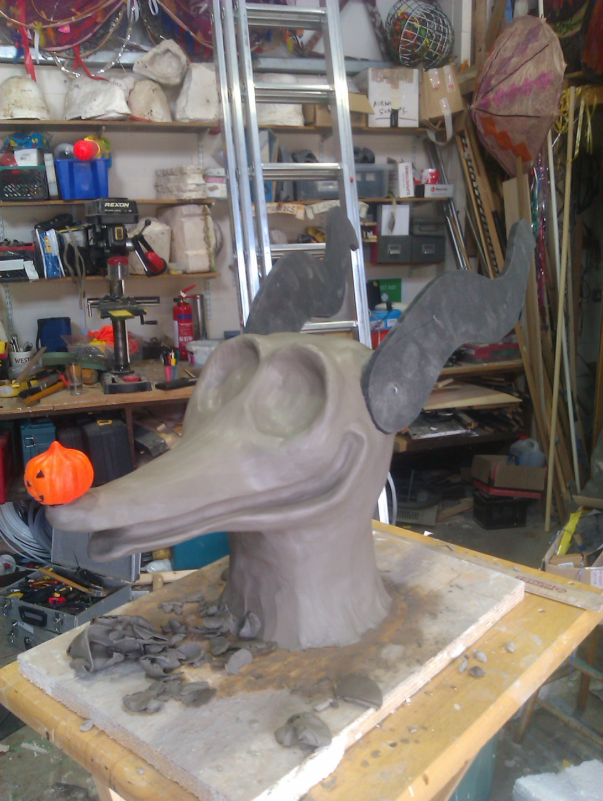 The ears were to be added later so plasterzote pieces where used just to give an idea. Finished puppet would also have a glowing pumpkin nose so that was placed on also.