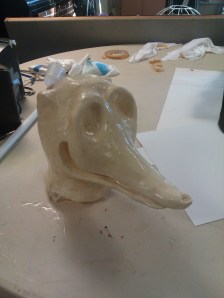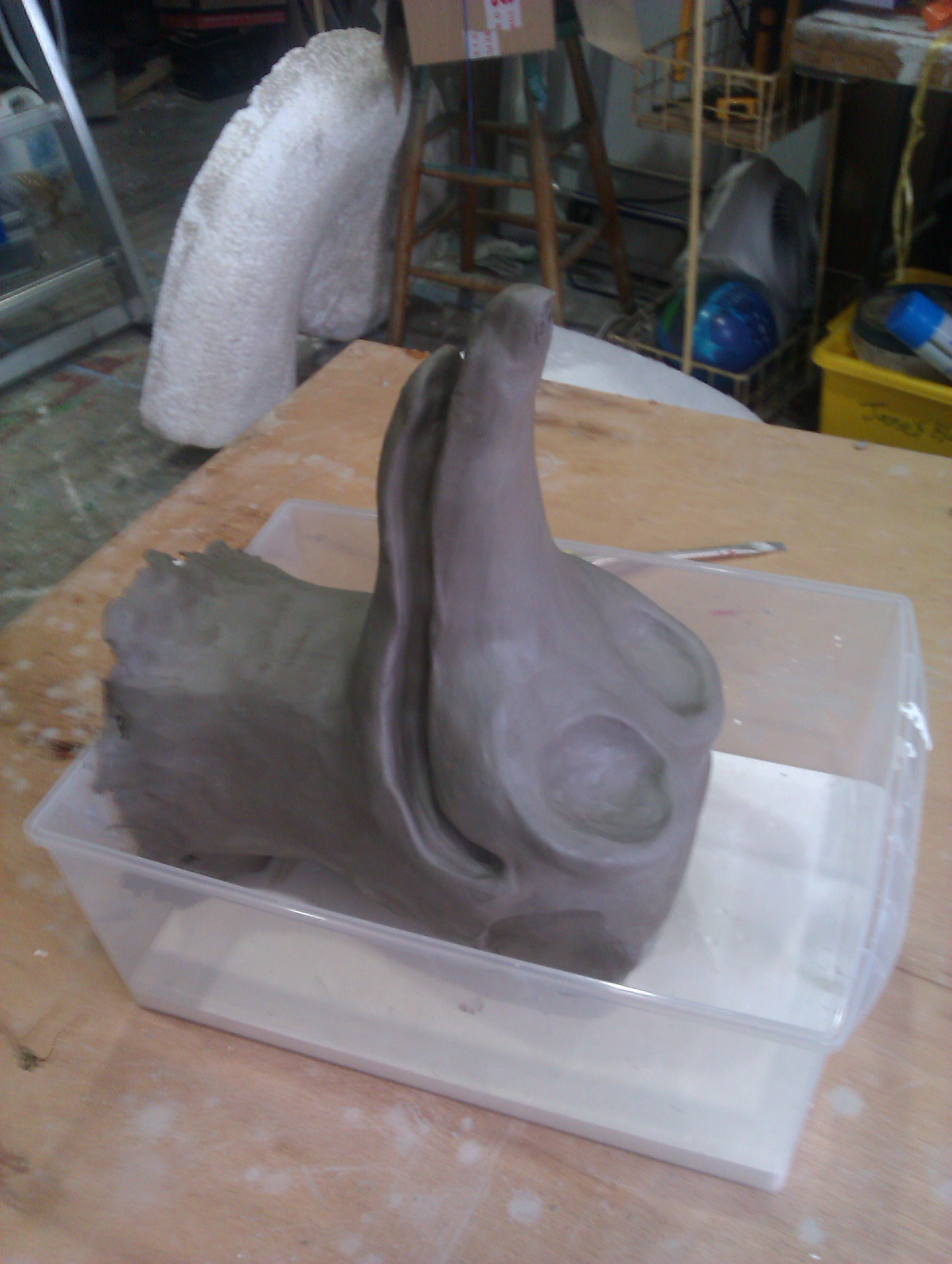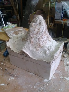 This picture shows the mould when the sides have been taken off and the whole mould removed from the box. The peak is where I scooped drying plaster onto the nose. You can see I’ve added sacking to the wet plaster to add strength.