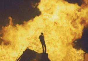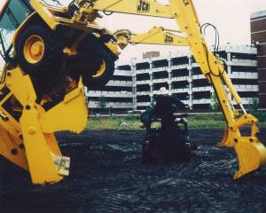 19 – That’s me just about to fall off the mini whilst the JCB’s formed an inappropriate triumphant arch. To the right you can see the snapping jaws of the chasing jcb. These jaws featured in the finale where 8 JCB’s performed a Mexican wave. I had to leap inside on of the buckets to be hoisted,’ comically’, into the air. Every other bucket had a pyrotechnic charge in it on a remote detonator.