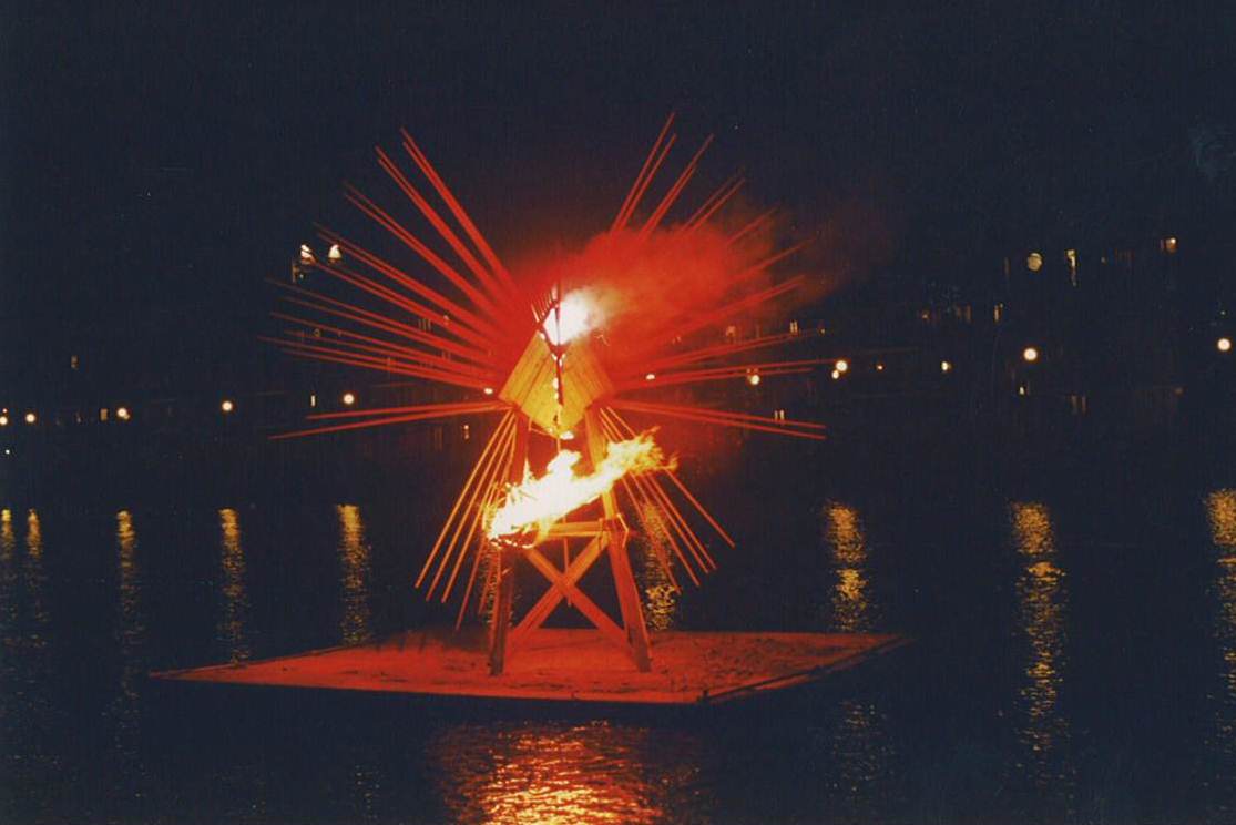15 – That’s right. A dragon row boat would row up once the fire was lit and take me to safety. Rehearsals were good, sadly a strong headwind on the night meant that the rowers were not of Olympic standards, still better late than never.