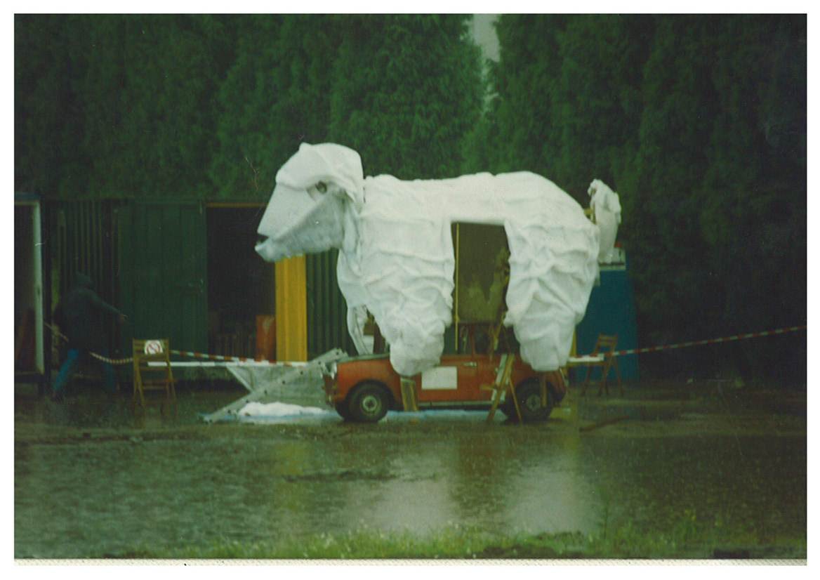 16 – That near slip almost put me off taking on such work, but a call from a distinguished theatre director lead to another commission. After all what could go wrong with a giant sheep build onto a mini cooper chased by JCBs?