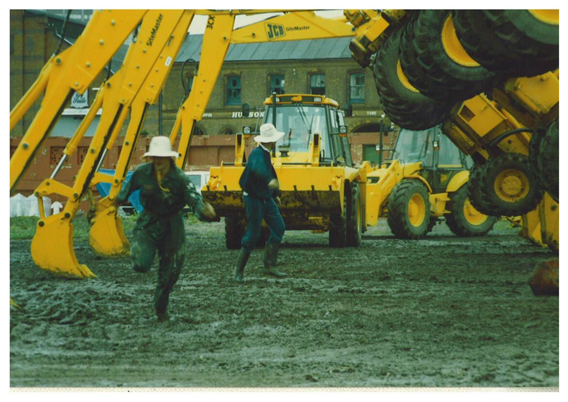 18 – I was persuaded to ‘perform’ in the final. This meant hiding, with another performer, inside the sheep as it was chased by some JBCs. Eventually the sheep came to a stop, legs were lowered and the mini cooper shot off leaving the sheep, and me, stranded. Pelting after the mini in an improvised comedy chase that would have given the Keystone Cops nightmares, all the while chased by JCB’s, we caught up with the mini.