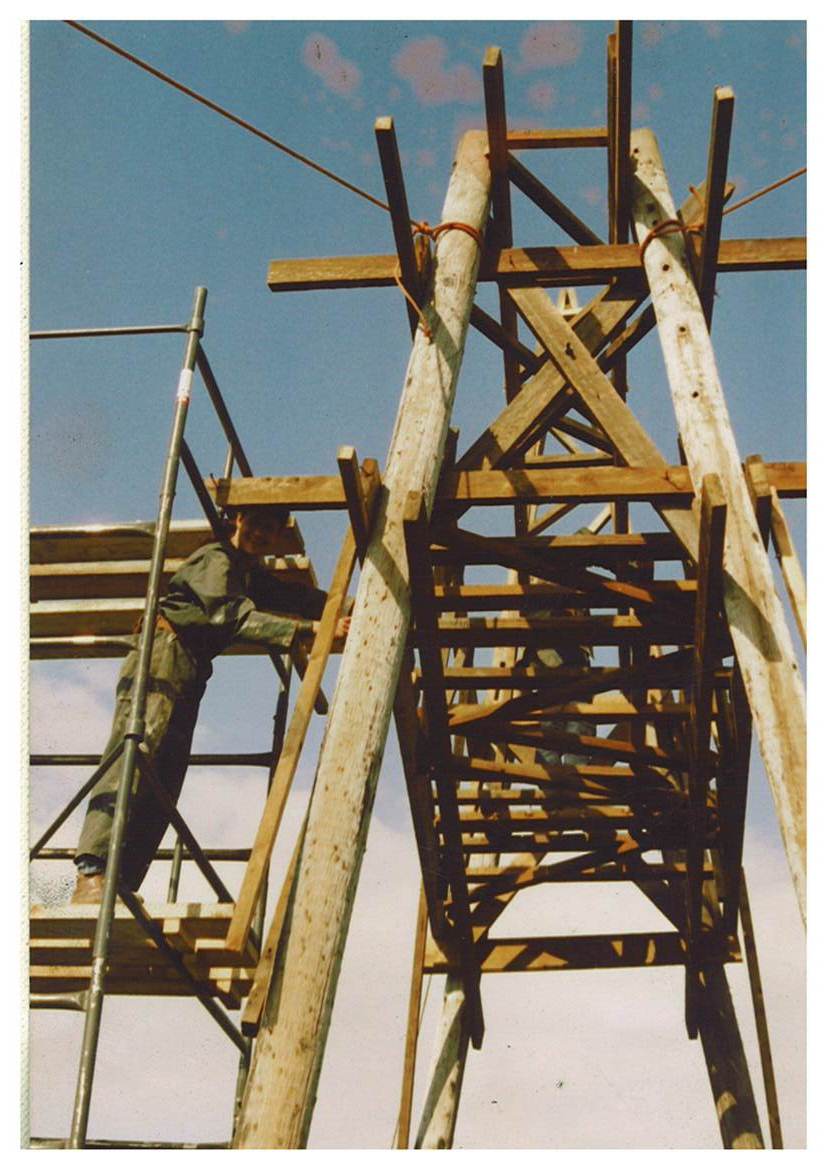 9 – This next piece was a commission by Opera North 1991. This had a rather unwelcome addition…having to shin up telegraph pole legs. So we now have the luxury of scaffolding. As you can tell by this picture I am quite pleased with this Health & Safety development. Can you tell what it is yet?