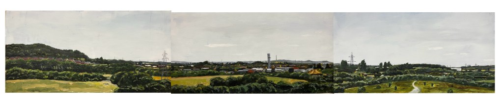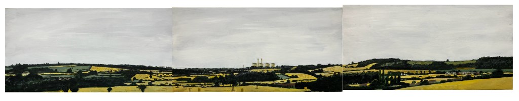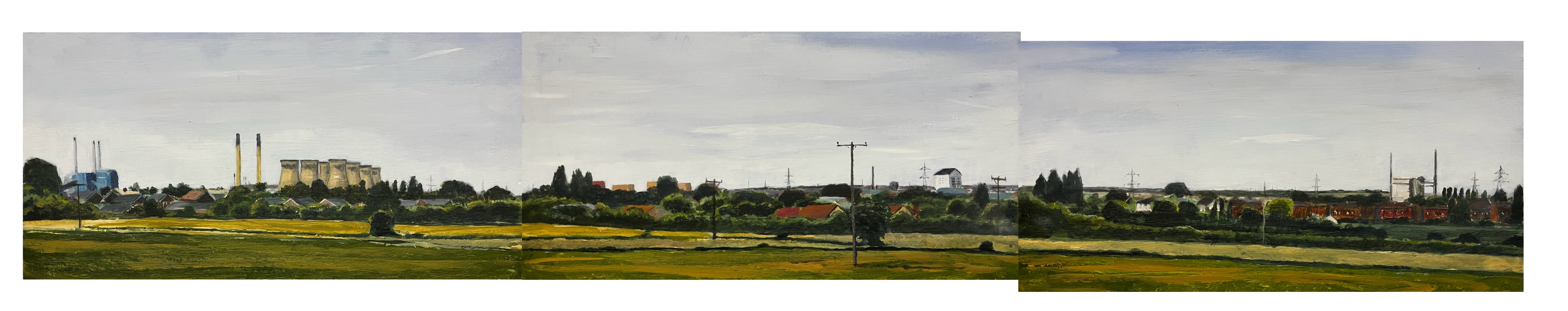 When executing the Boundary No Boundary project I was often asked what the view was like looking INTO the Wakefield District. I combined the request with my desire to capture the changing landscape of that area, as the megastructures of the post-war industrial boom are slowly decommissioned and replaced by new industries. These four paintings, triptychs similar to Boundary No Boundary, are the first steps, views from the edge of the district at a turning point in its appearance.