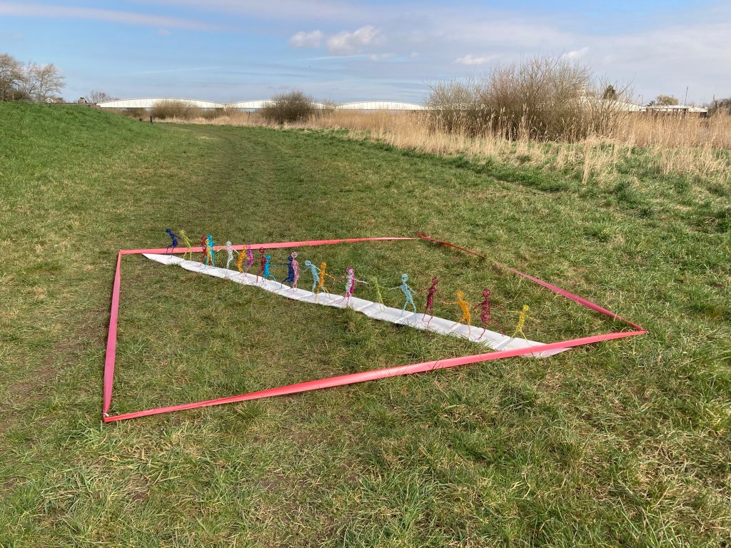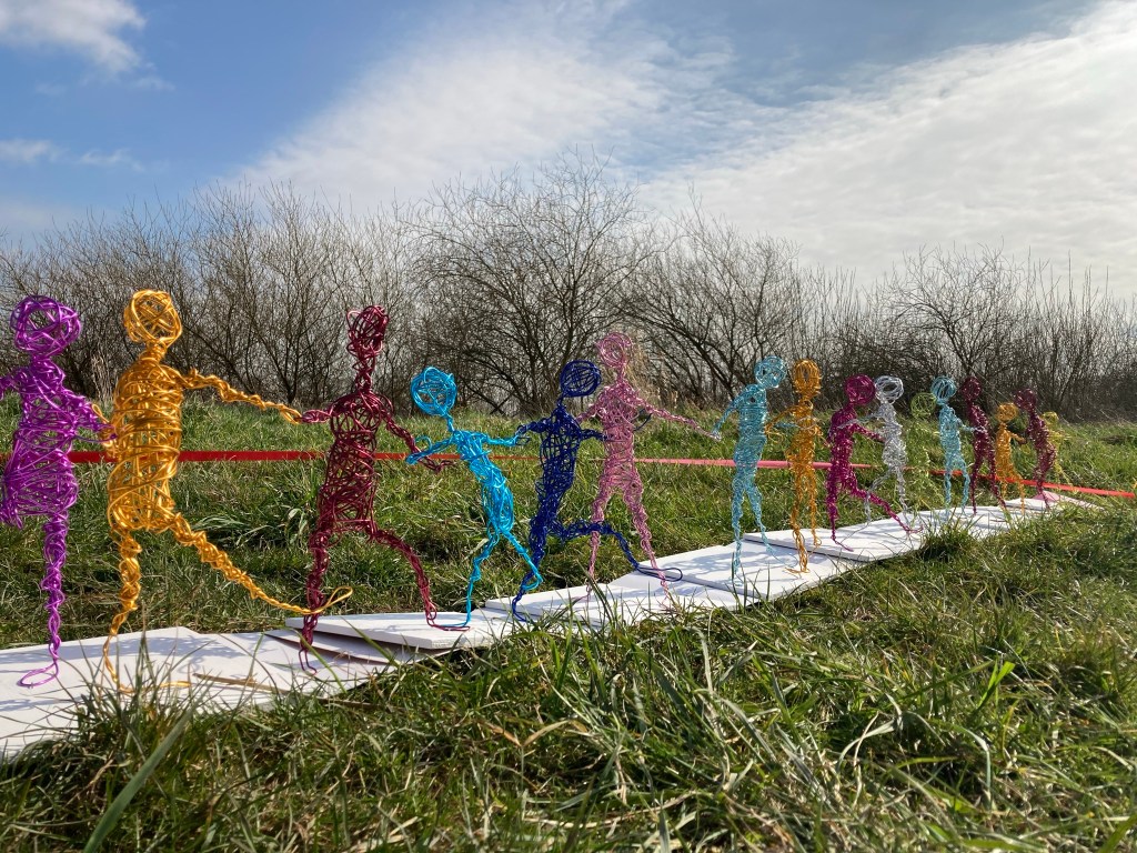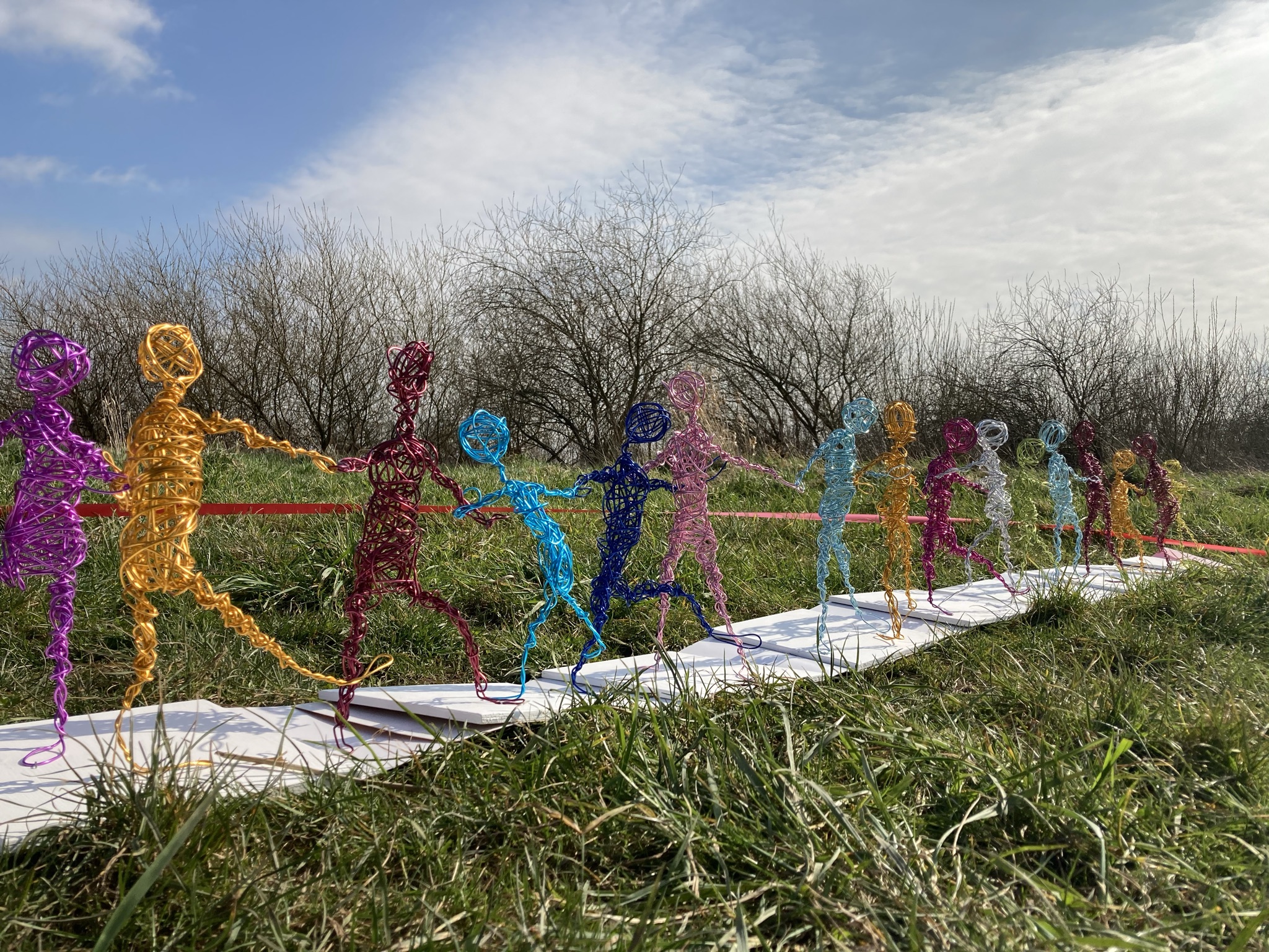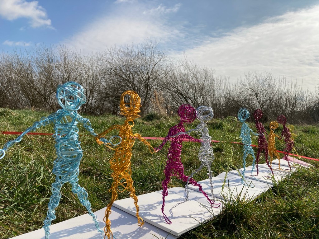 Along this line I created a sculptural installation of small figures (approx. 30cm tall). They are made from aluminium wire. They are doing something we can rarely do these days, which is to contact each other. They are holding hands, embracing, and dancing together, along this imaginary line.