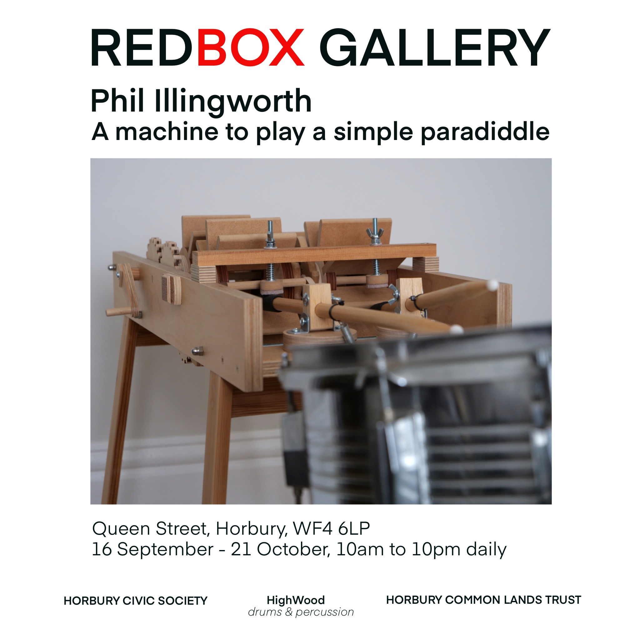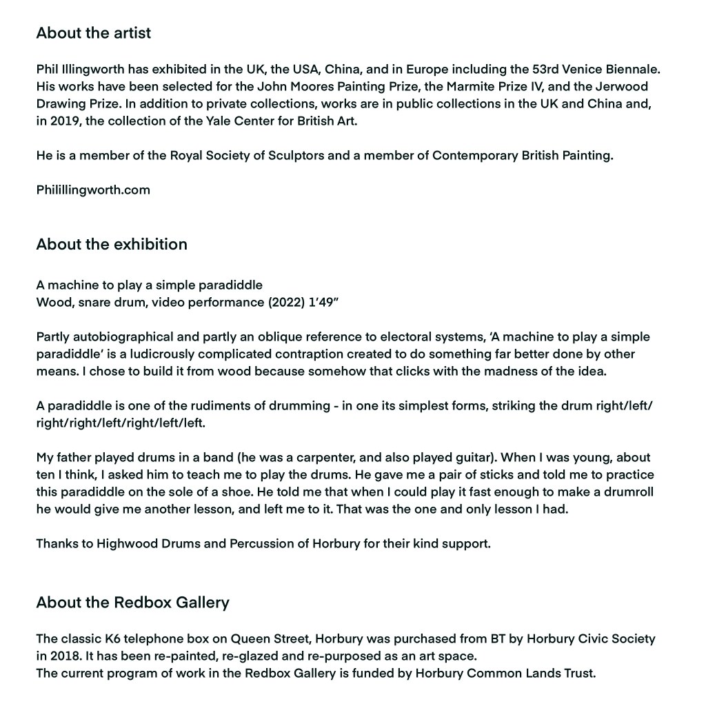 The first exhibition I’ll be curating is by Phil Illingworth and is called ‘A machine to play a simple paradiddle‘
