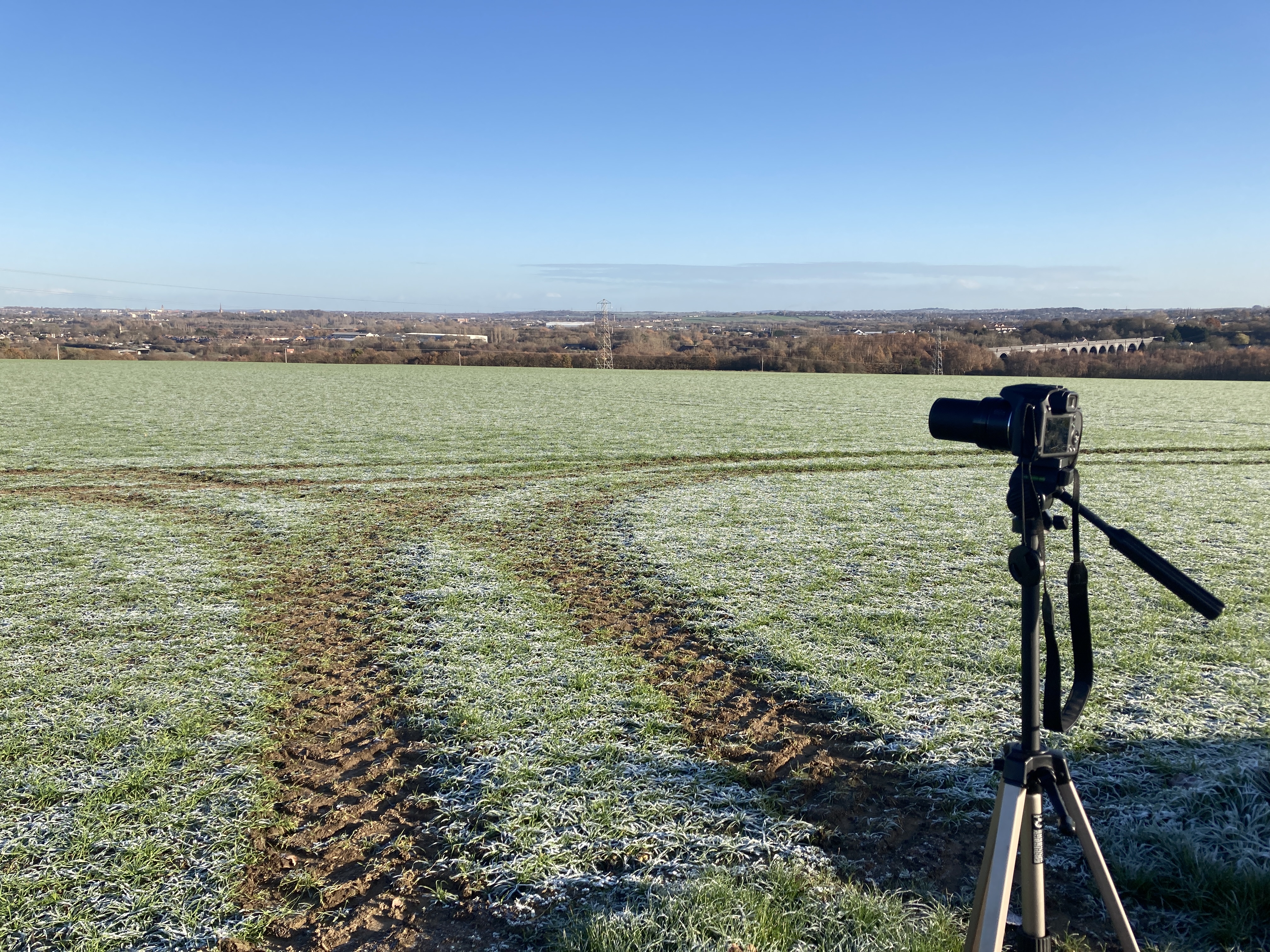I was amazed at how much I could see with the 60 X zoom I had on the camera. I was also surprised at how many photographs I would have to take to get the view in. I stuck with just photographing the strip of landscape that was naturally framed by both the field line in the foreground and by the power lines between the pylons in the middle distance. I figured out that those two lines would help me to assemble the photographs later. I realised that if I used the 3-second timer I would be there for hours so I took the photographs using the shutter button and tried not to shake the camera too much (which was hard in the cold). It was only when I got back to the studio that I saw I had taken 438 photographs. Rather than assemble the panorama digitally, I thought I should send the photographs to be developed and then assemble them by hand.