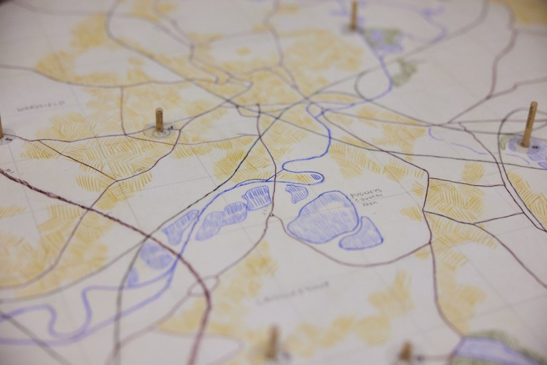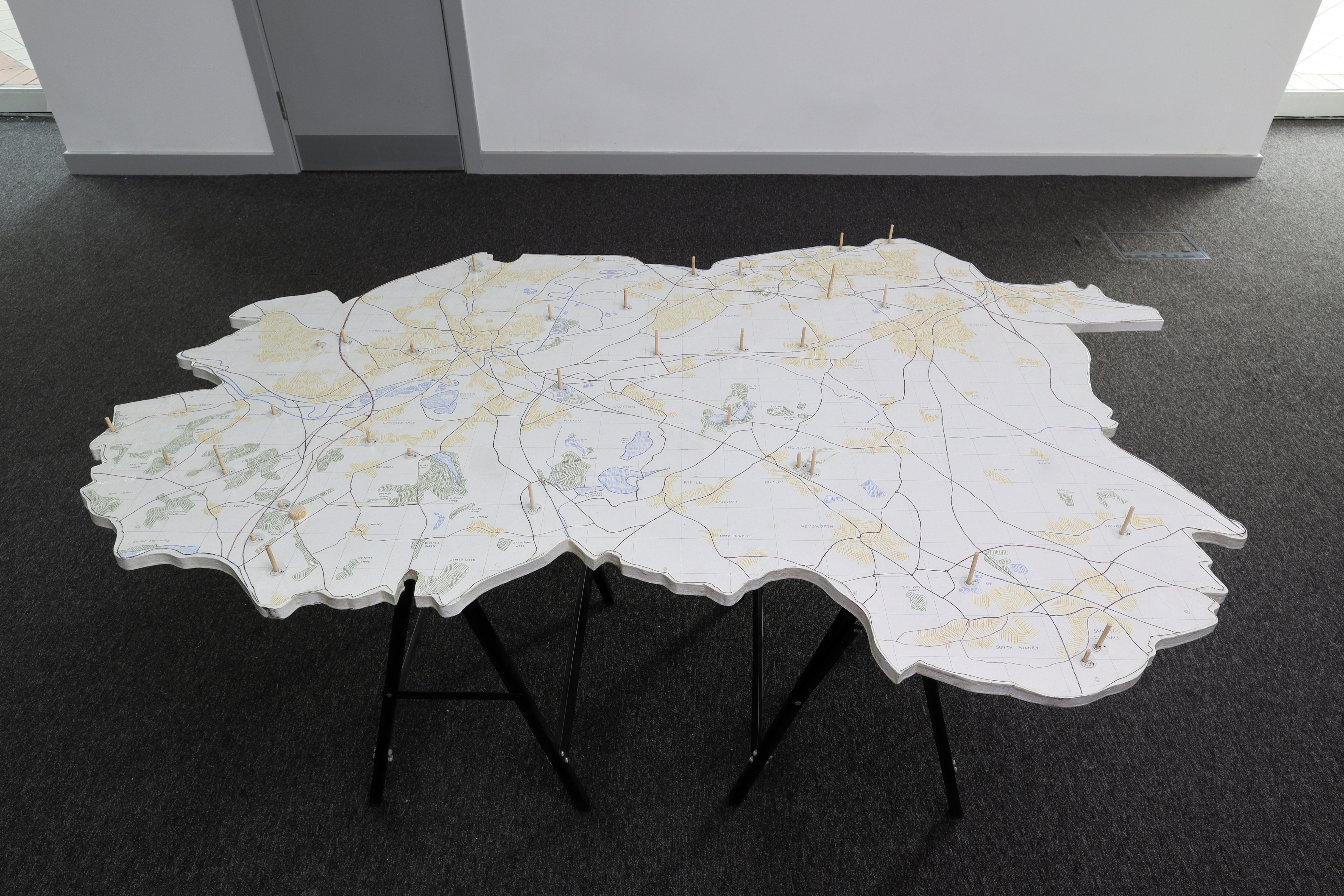 This piece is a 1 to 16,000 scale map of the Wakefield District showing the locations, (and depths) of the 34 collieries that used to exist within its boundary. (Funded by Wakefield Council Culture Grants)