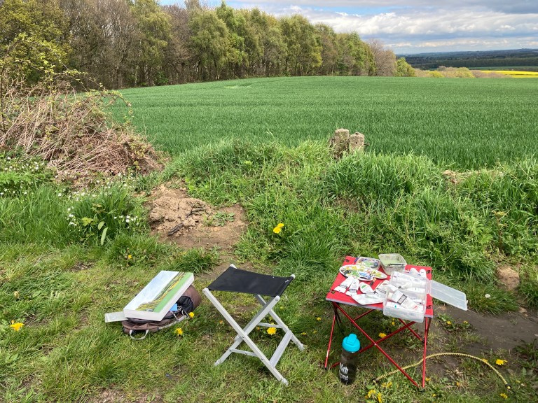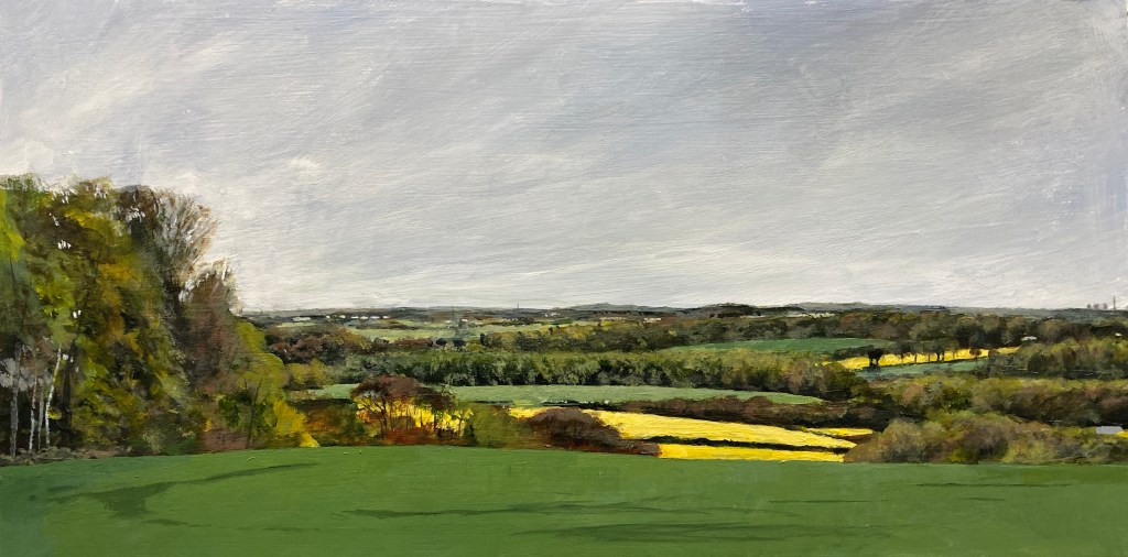 On the 1st of May 2023, I headed out along Woolley Edge to find a place to paint, plein air, one of the Ancient Woodlands in the Wakefield District. In fact, I found a good place to paint 4. I took a 40cm x 20cm cradled wooden panel to paint on. I wanted to keep the 1×2 format I’d previously used for Boundary No Boundary.