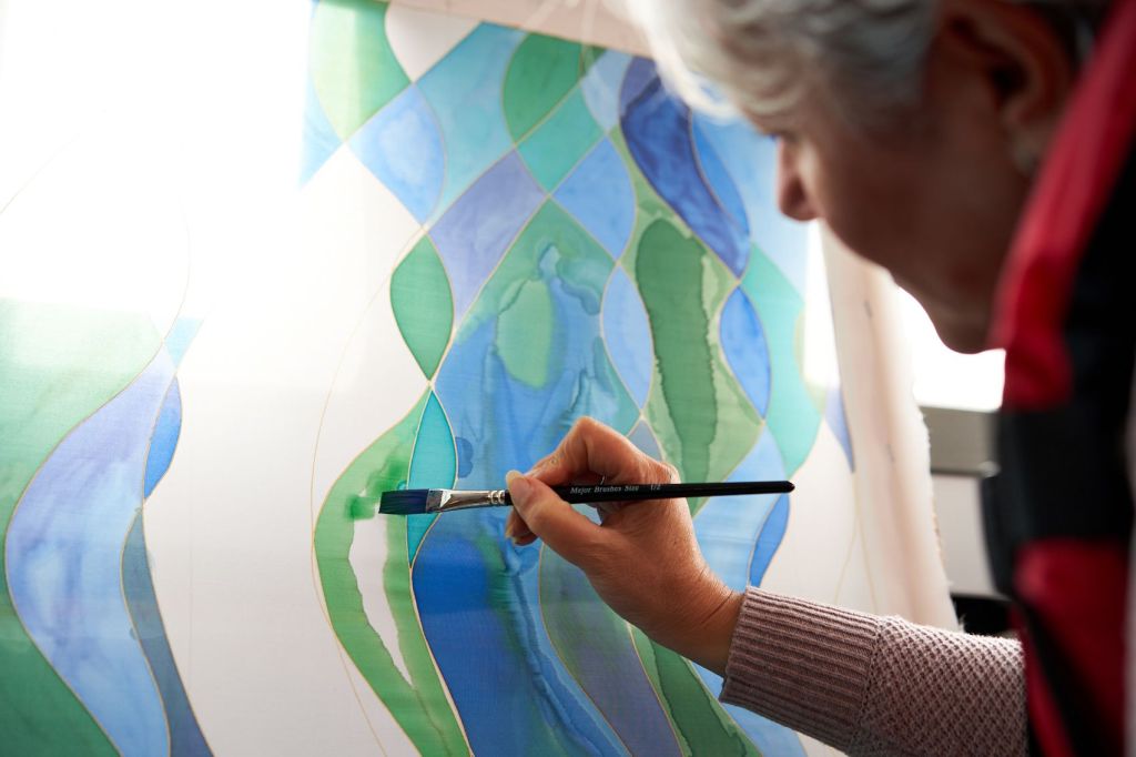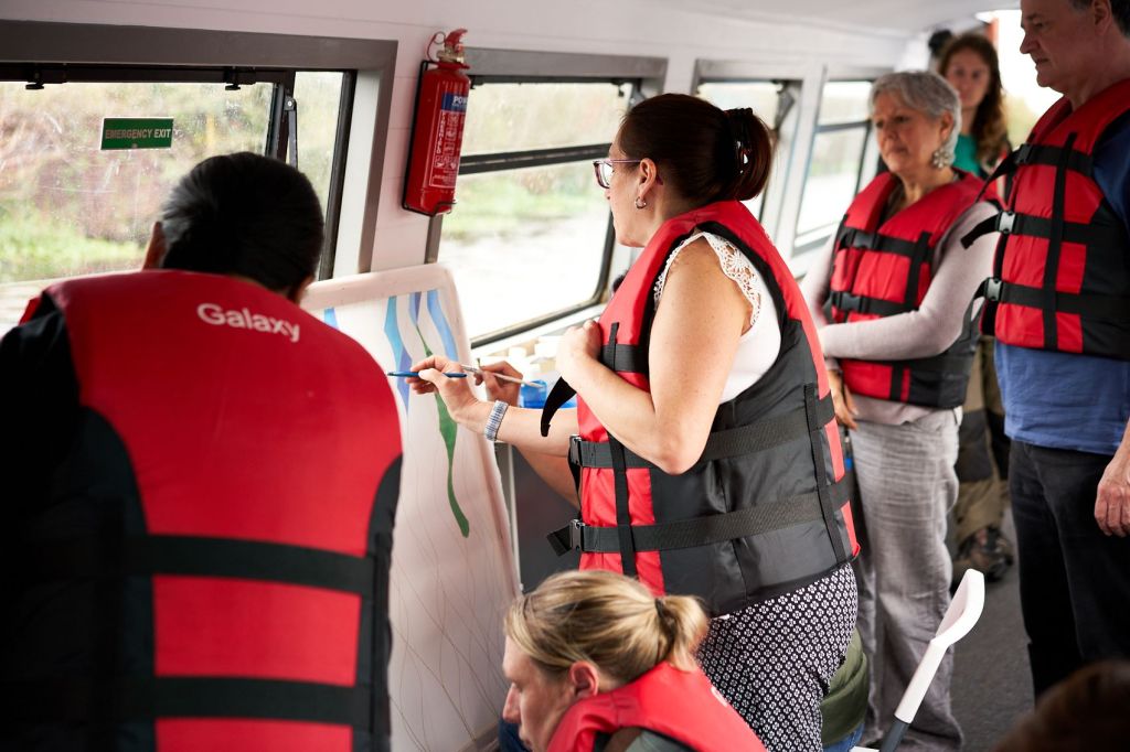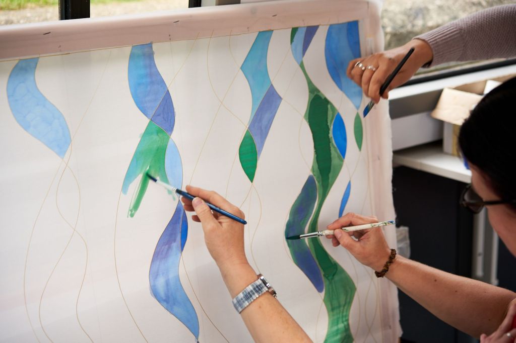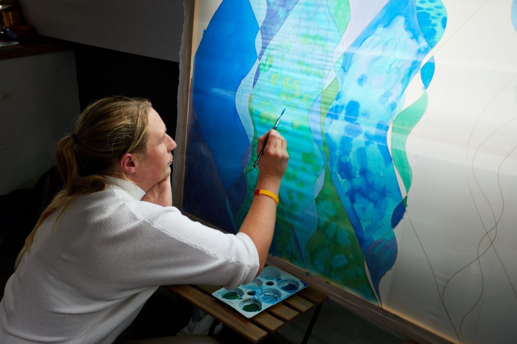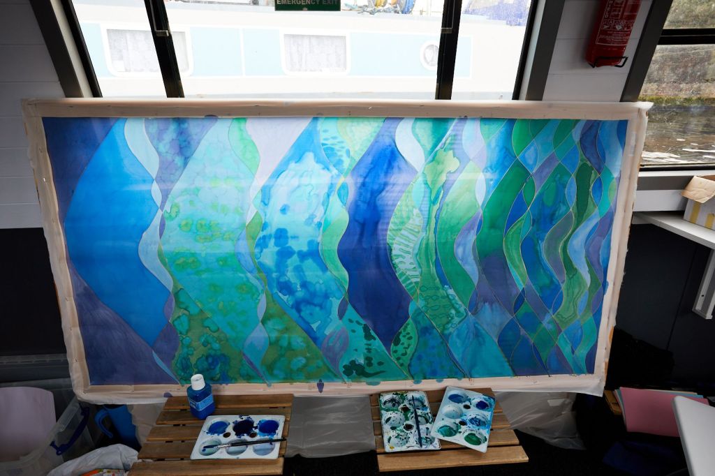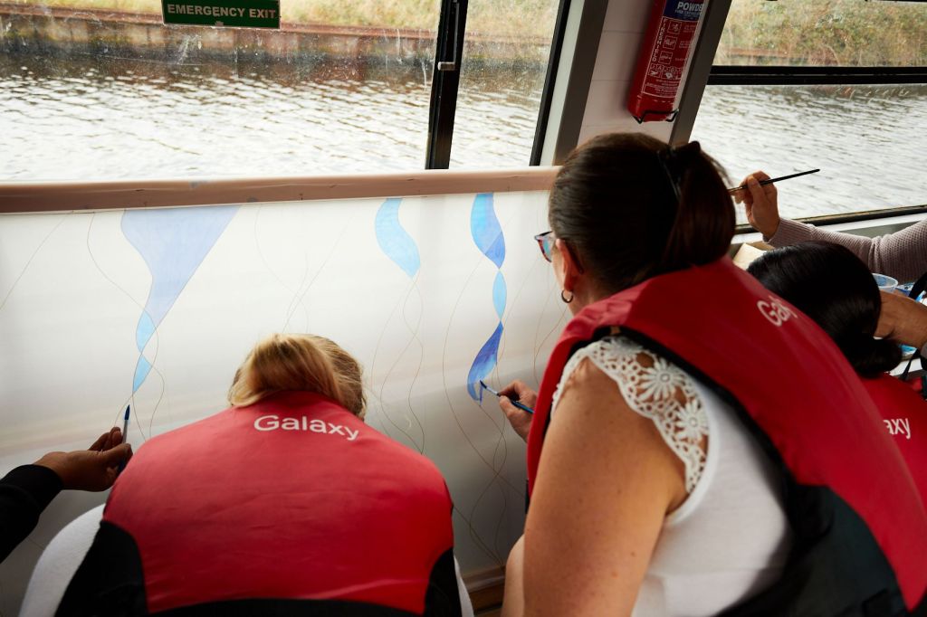 These photographs show the painting of one of the panels for Standing Waves by participants from the Well Women Centre. This canal trip and painting session took place on Saturday 7th October 2023 as the barge sailed on the Aire and Calder Navigation from Stanley Ferry to Whitwood.