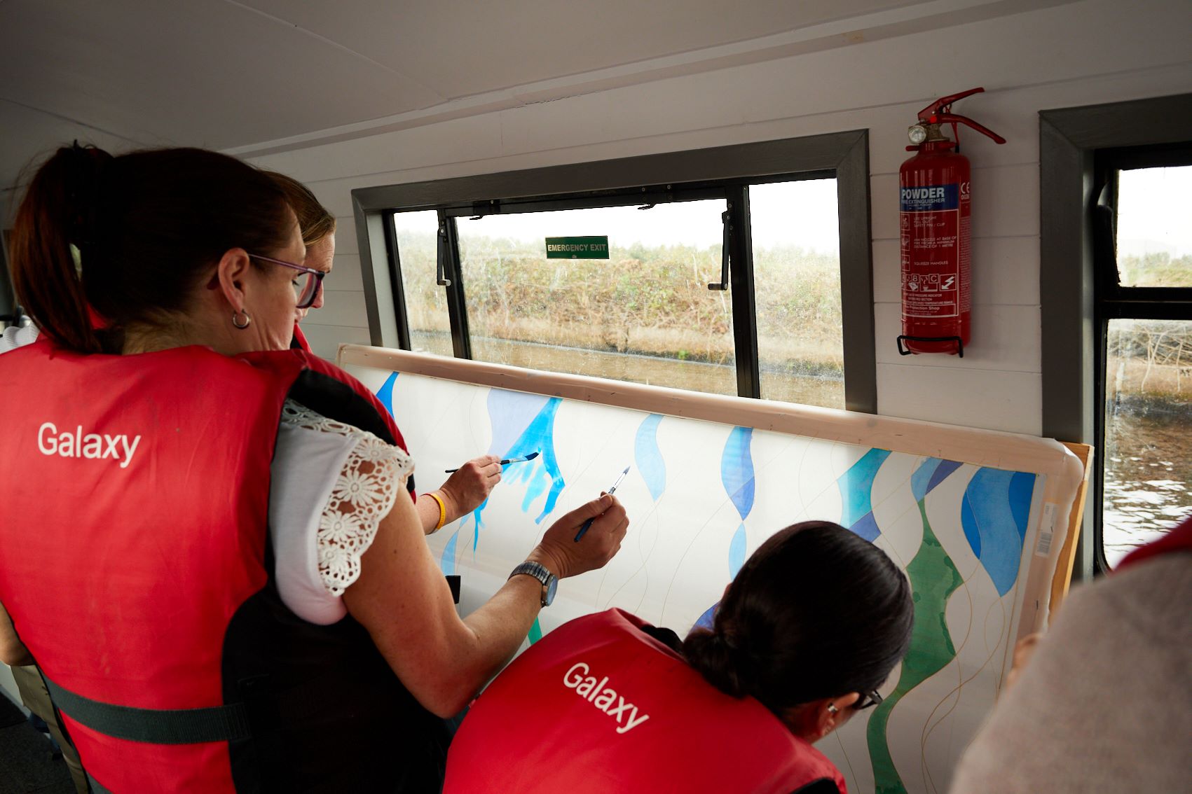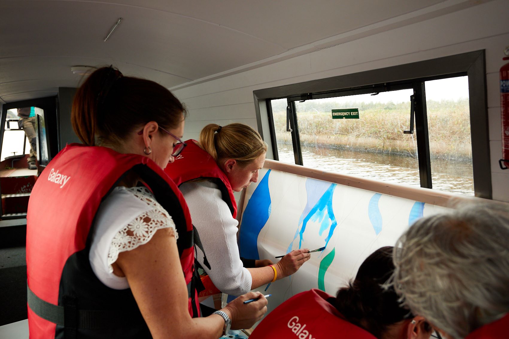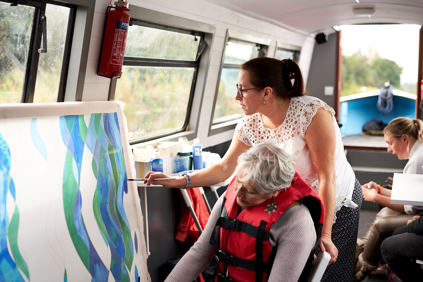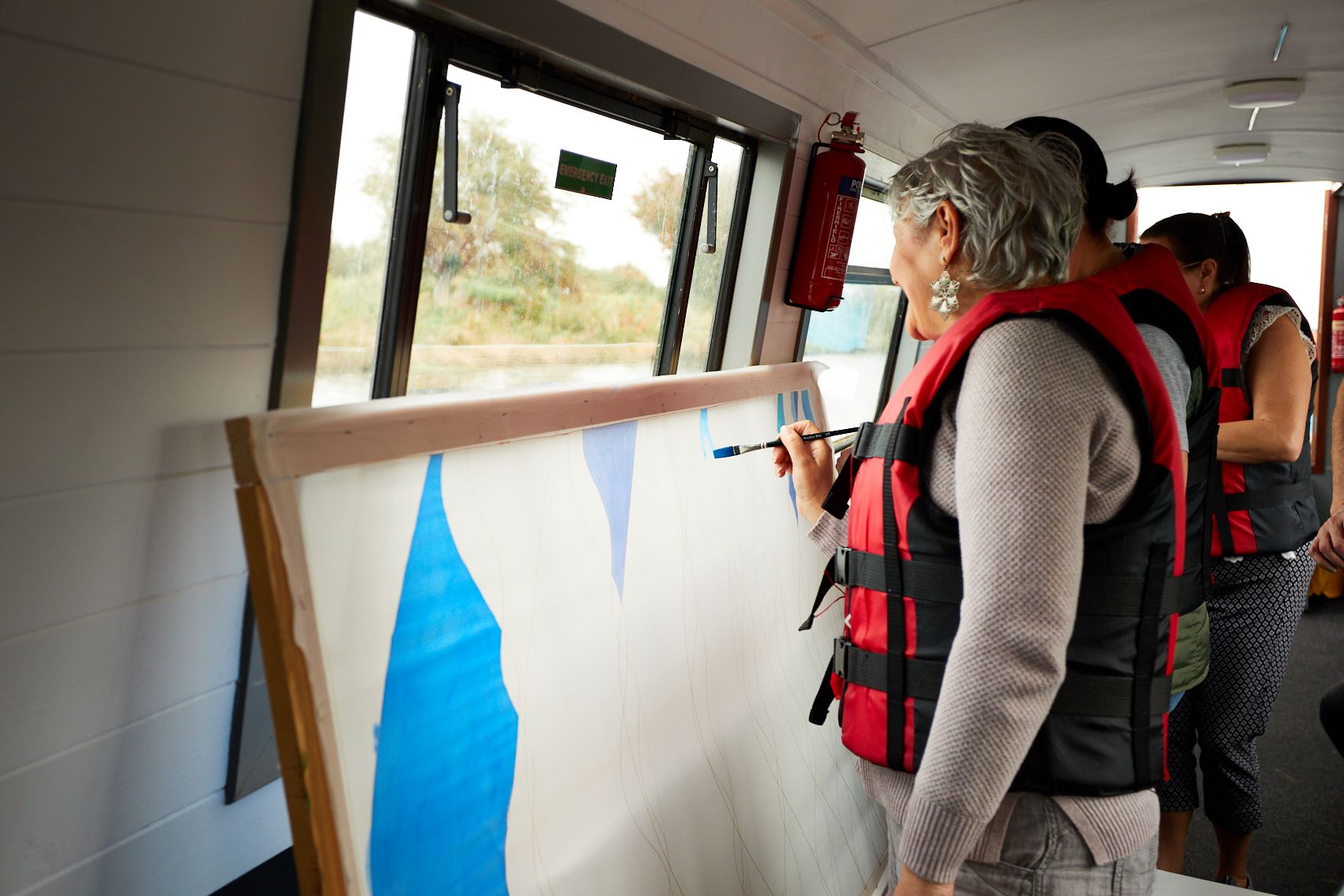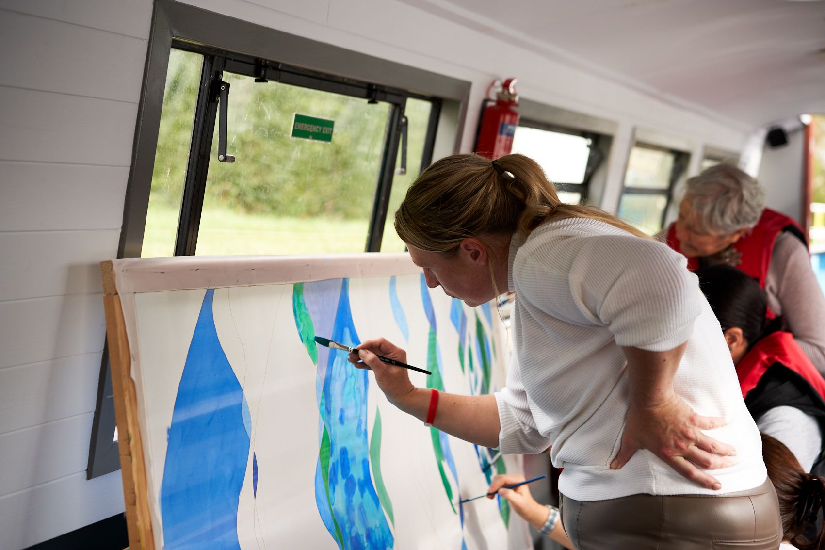 These photographs show the painting of one of the panels for Standing Waves by participants from the Well Women Centre. This canal trip and painting session took place on Saturday 7th October 2023 as the barge sailed on the Aire and Calder Navigation from Stanley Ferry to Whitwood.