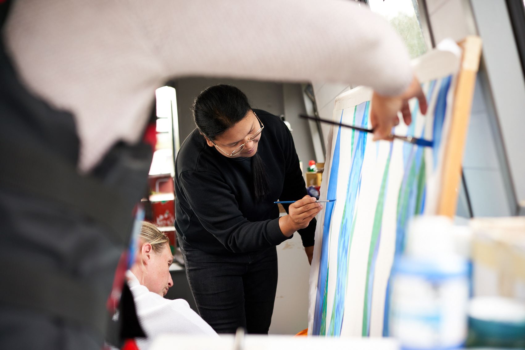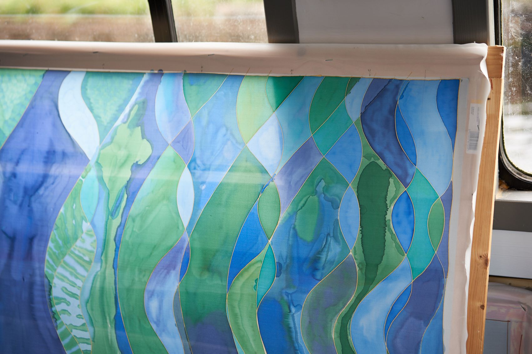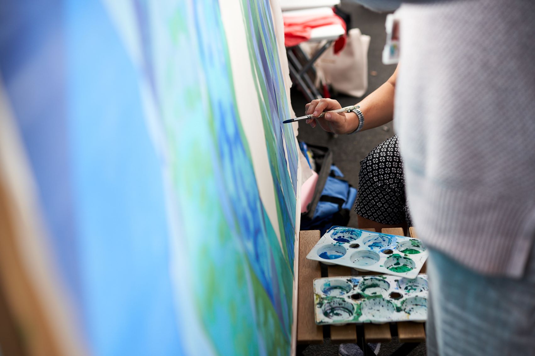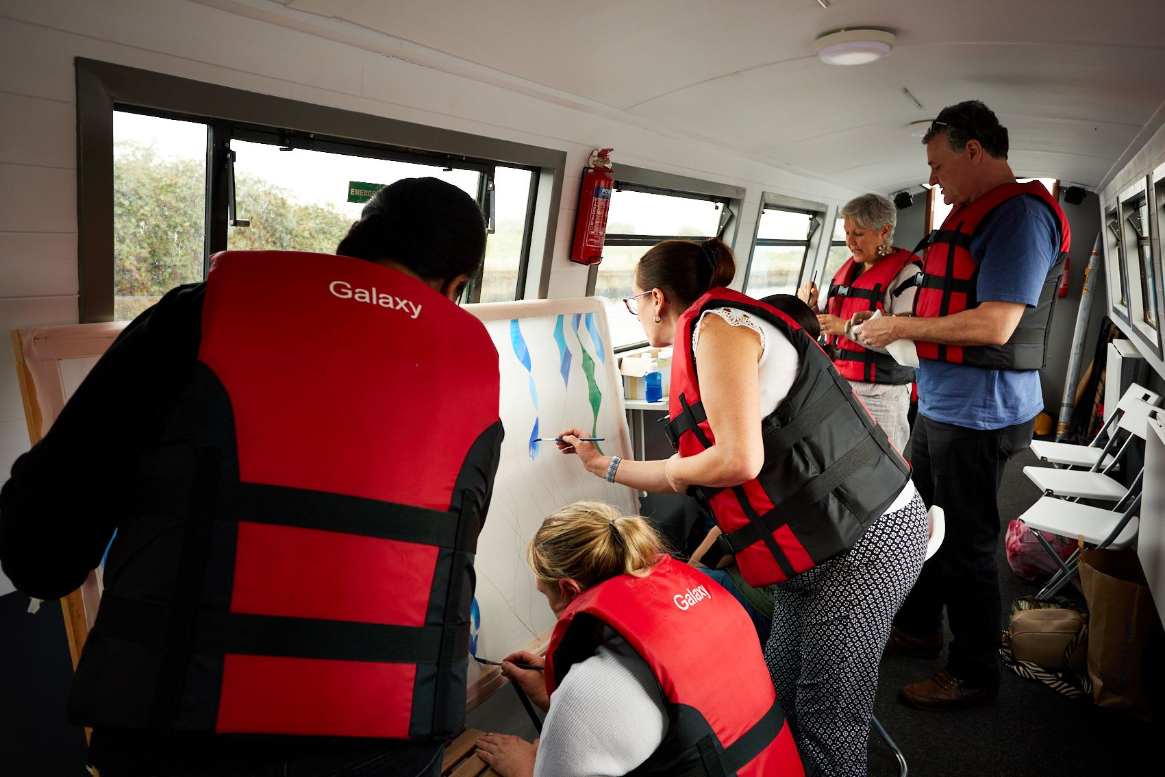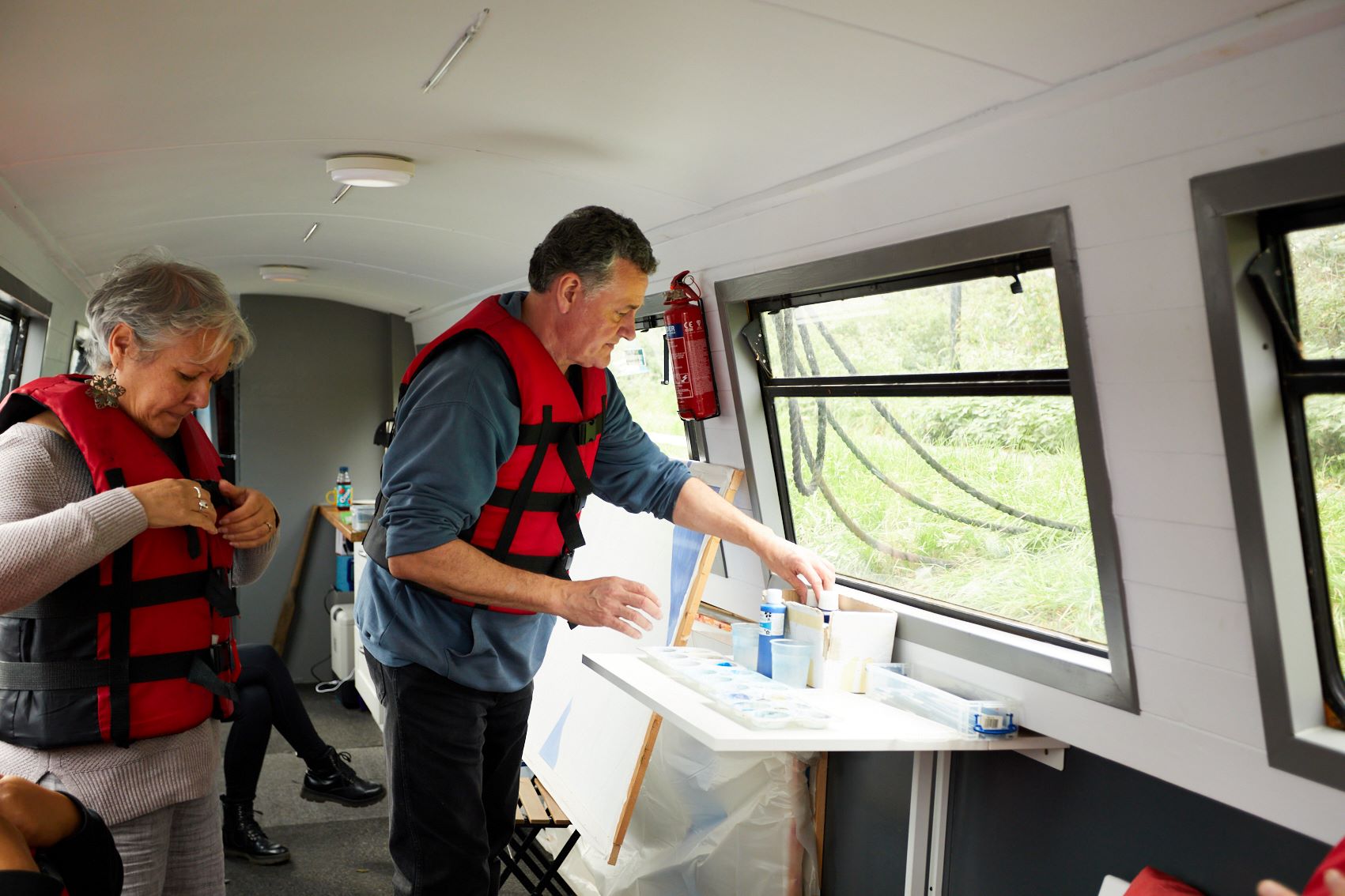 These photographs show the painting of one of the panels for Standing Waves by participants from the Well Women Centre. This canal trip and painting session took place on Saturday 7th October 2023 as the barge sailed on the Aire and Calder Navigation from Stanley Ferry to Whitwood.