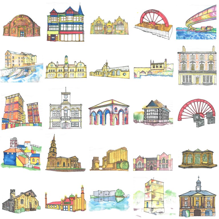 A recent project for the South West Yorkshire Partnership NHS Foundation Trust. I was commissioned to create 20 illustrations of places in the Wakefield district to be used in local NHS correspondence. Instead, I proposed to run up to 20 silk painting workshops with service users with diagnosed mental health problems as a way of sharing ownership in the work and promoting arts as a tool for promoting wellbeing. The landmark buildings were suggested during the workshops.