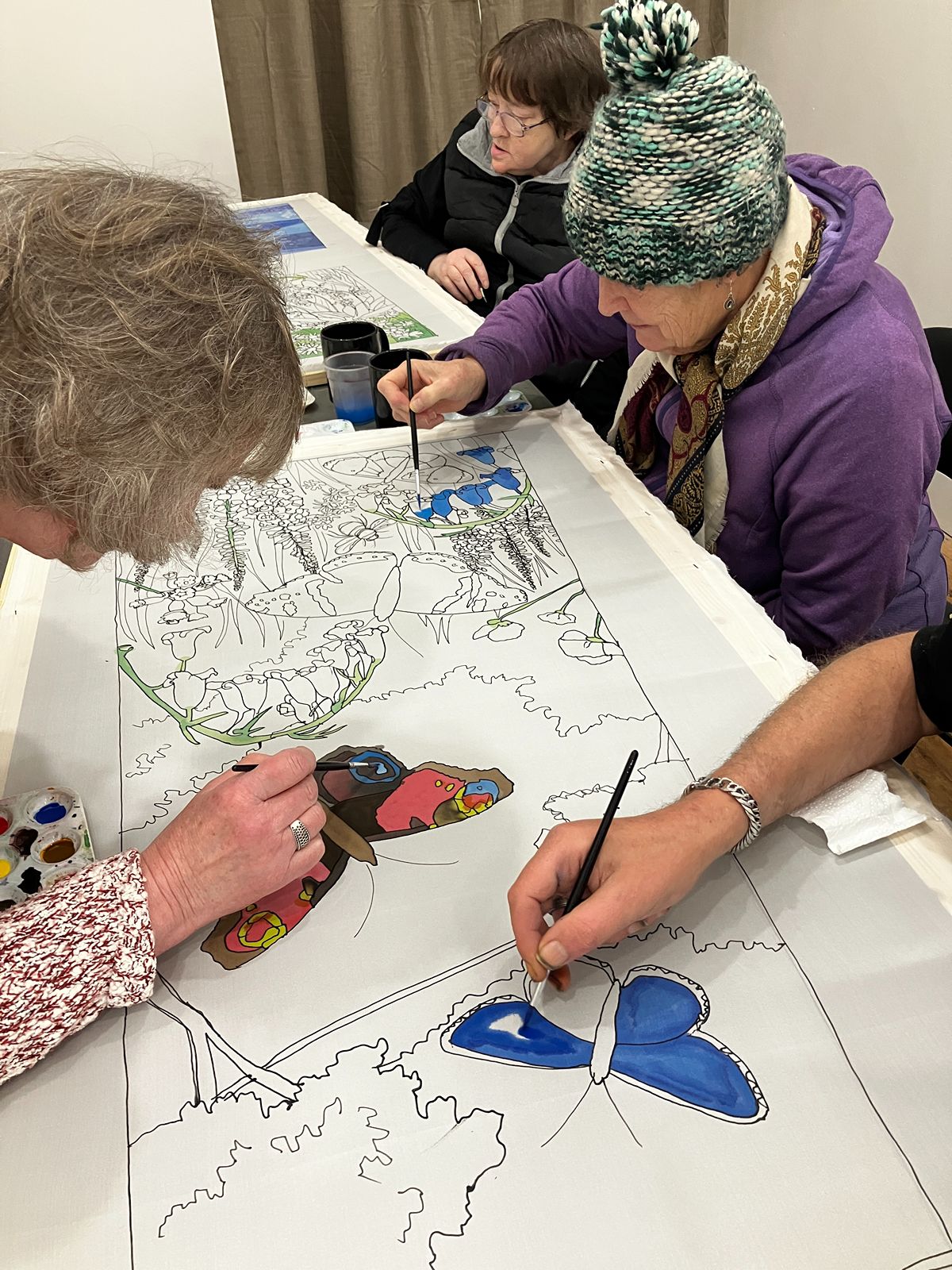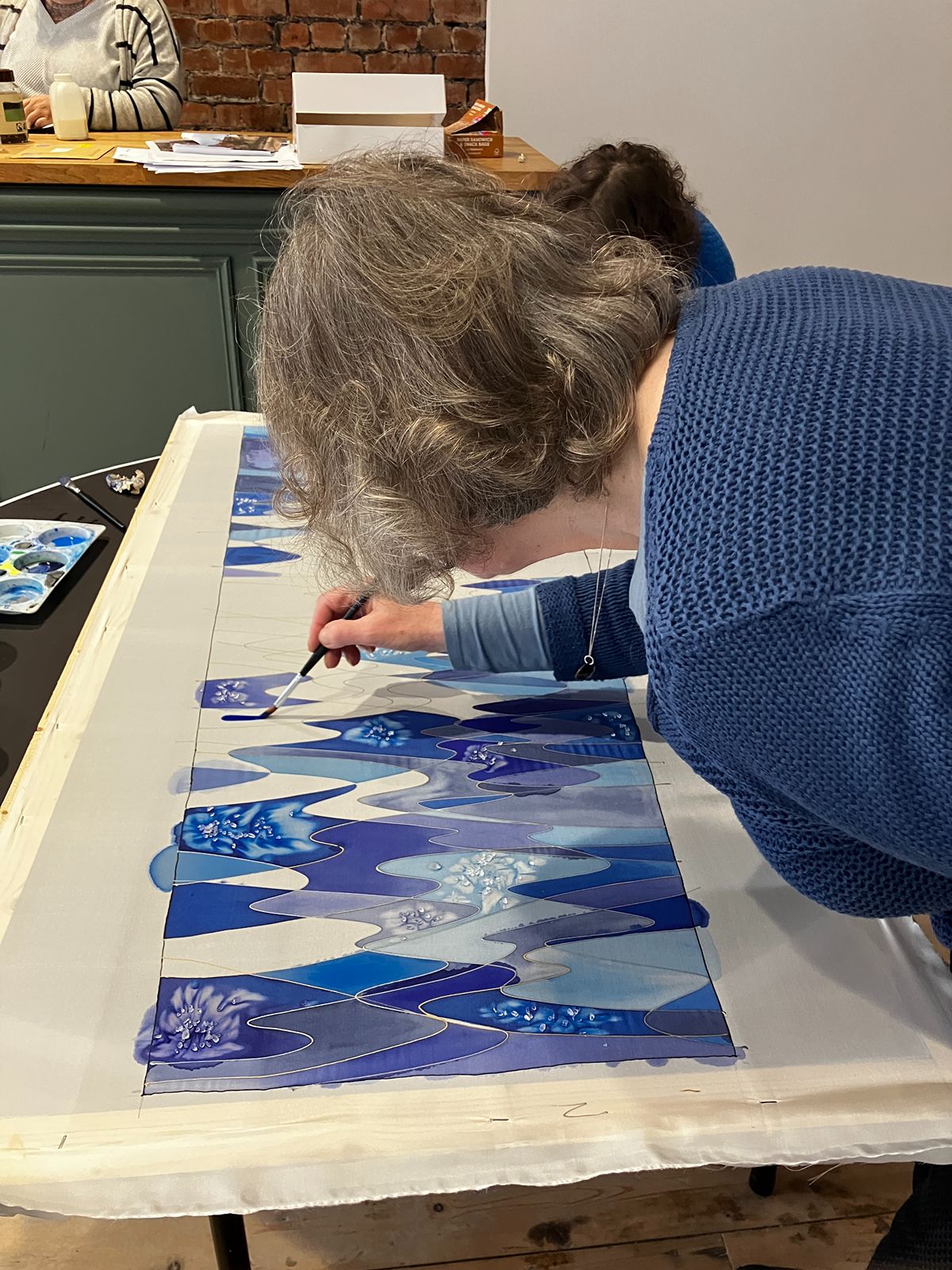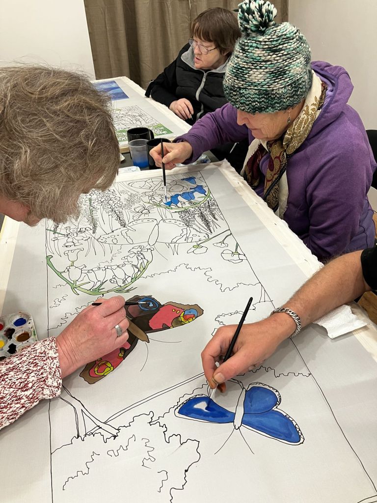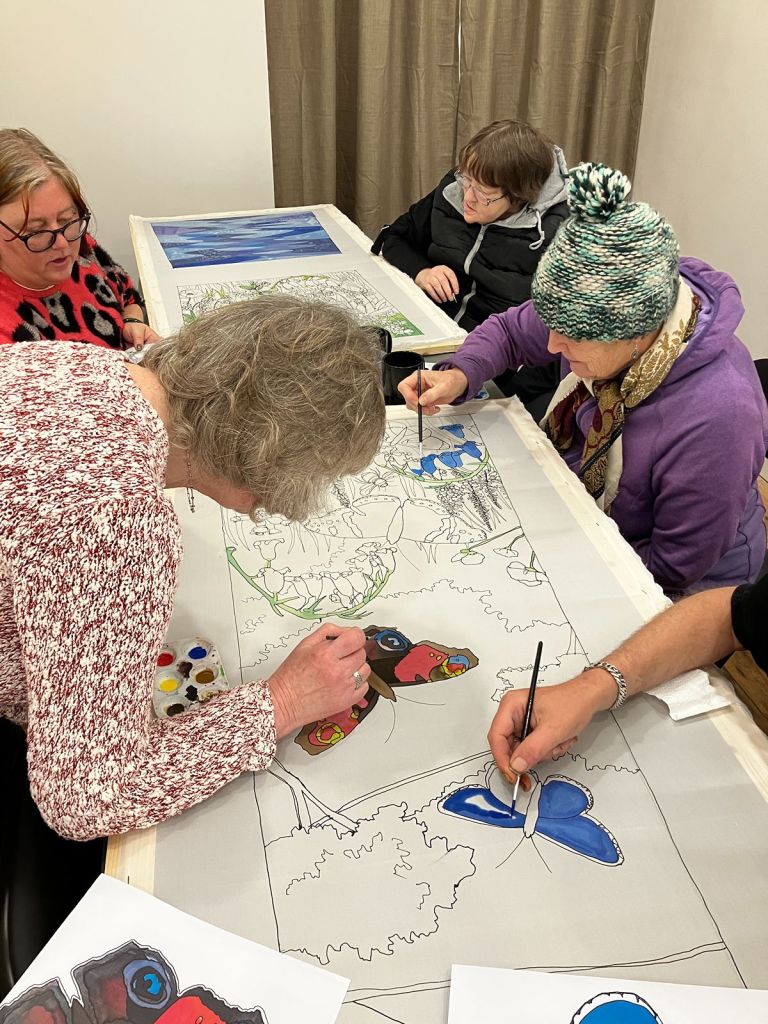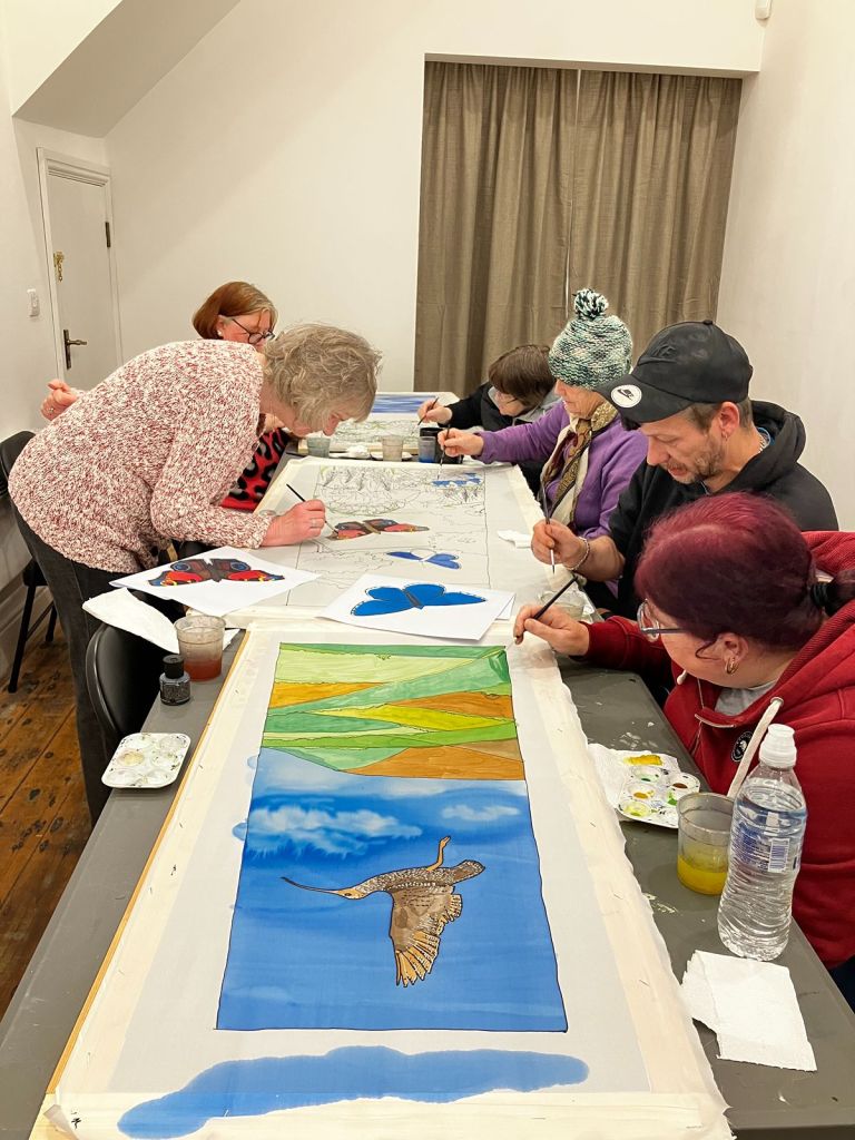 The group started off by making small individual silk paintings before progressing to larger collaborative pieces.