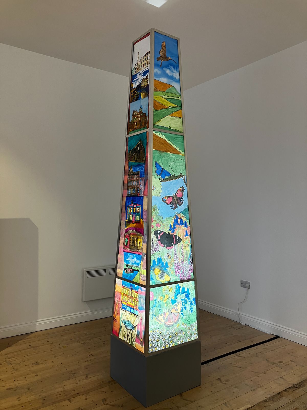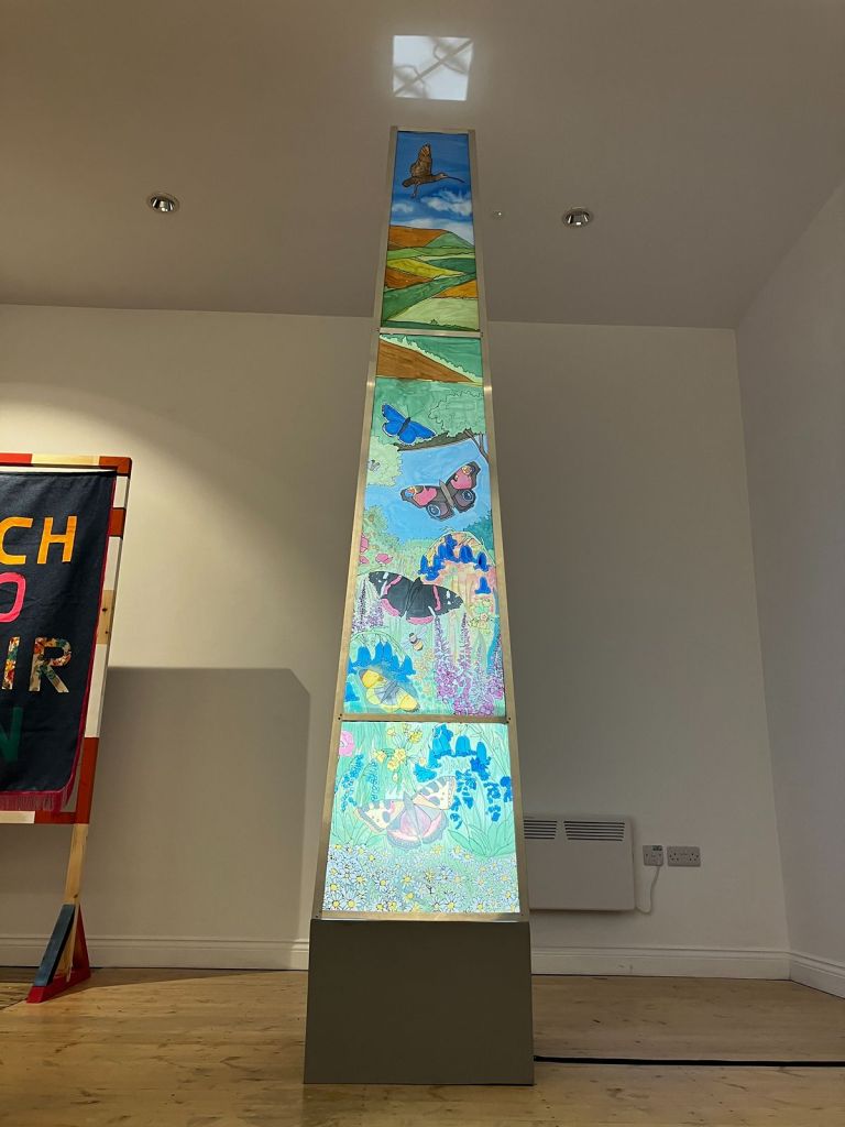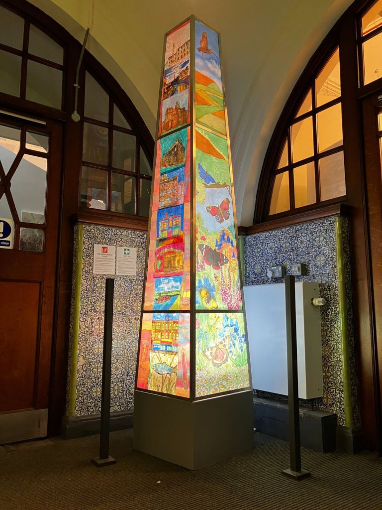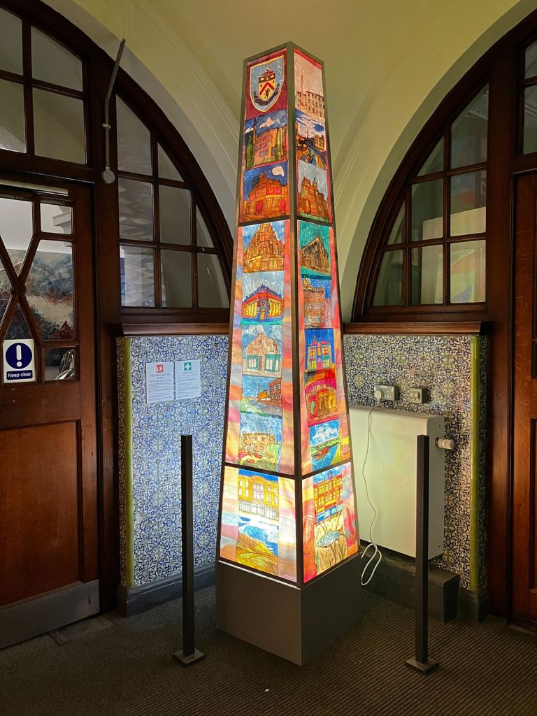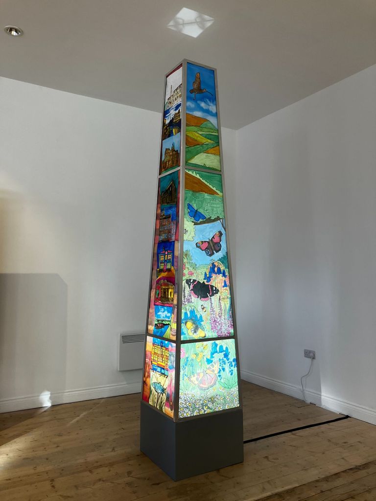 In 2025, I was commissioned by Ground Up in Brurnley to work with the group to create a piece for an exhibition in Gallery OneTwoThree. Over 10 sessions, we created an illuminated chimney depicting scenes from Burnley, including iconic buildings from the town. It also shows images of Burnley’s countryside and waterways.